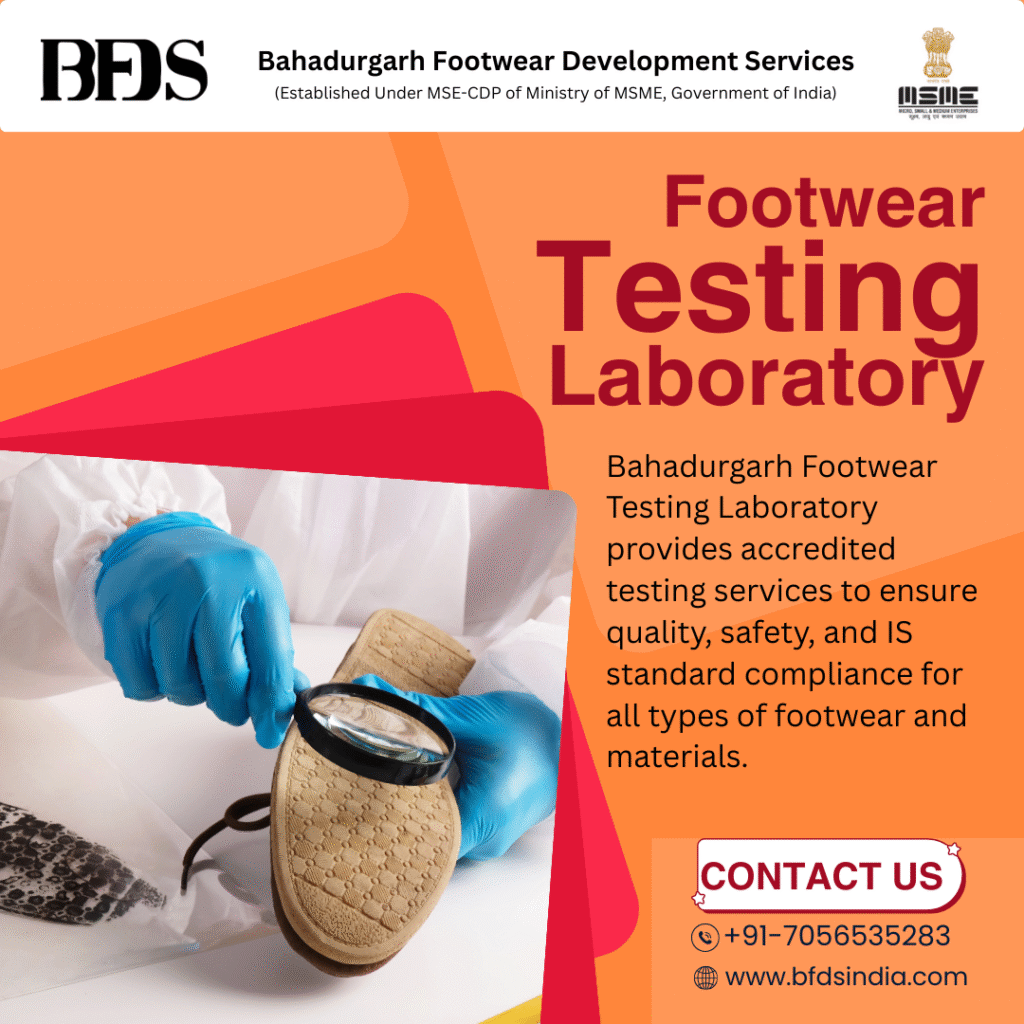 Bahadurgarh Footwear Testing Laboratory, operated by Bahadurgarh Footwear Development Services (BFDS), is a trusted and accredited laboratory established under the MSE-CDP scheme of the Ministry of MSME, Government of India. The laboratory provides comprehensive footwear and footwear material testing services to ensure quality, safety, durability, and IS standard compliance.