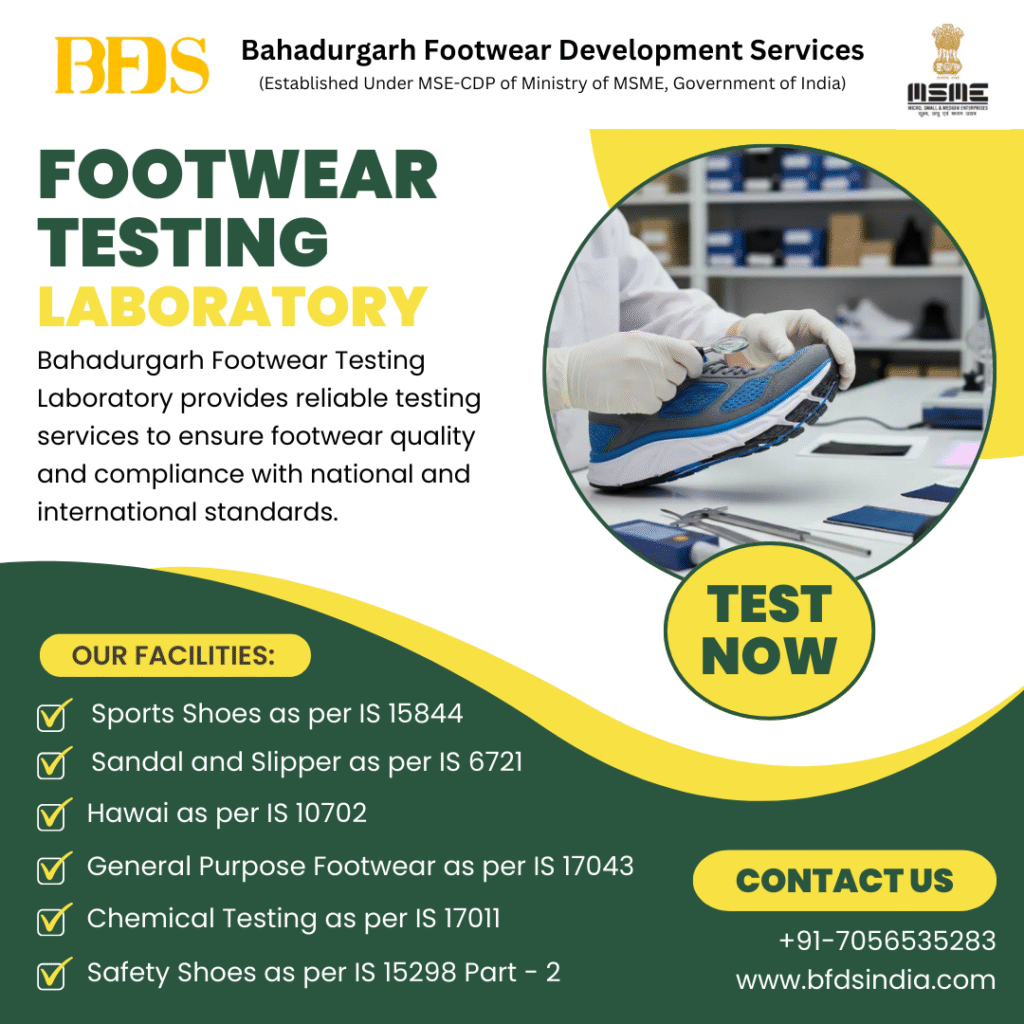Bahadurgarh Footwear Testing Laboratory, operated under Bahadurgarh Footwear Development Services (BFDS), provides professional and reliable footwear testing services to ensure product quality, safety, and compliance with Indian Standards. Established under the MSE-CDP scheme of the Ministry of MSME, Government of India, the laboratory supports manufacturers, exporters, and footwear units with accurate and trusted testing solutions.