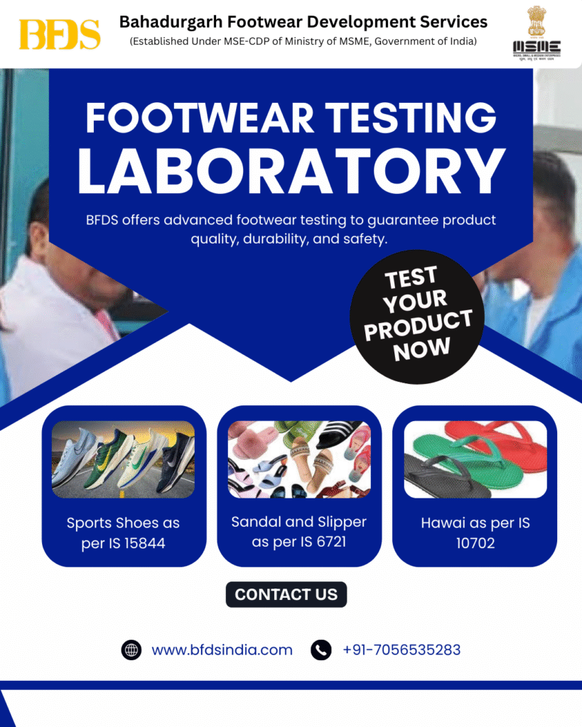 Bahadurgarh Footwear Development Services (BFDS) operates a state-of-the-art Footwear Testing Laboratory established under the MSE-CDP scheme of the Ministry of MSME, Government of India. The laboratory is dedicated to ensuring footwear quality, durability, performance, and safety in accordance with Indian Standards (IS).