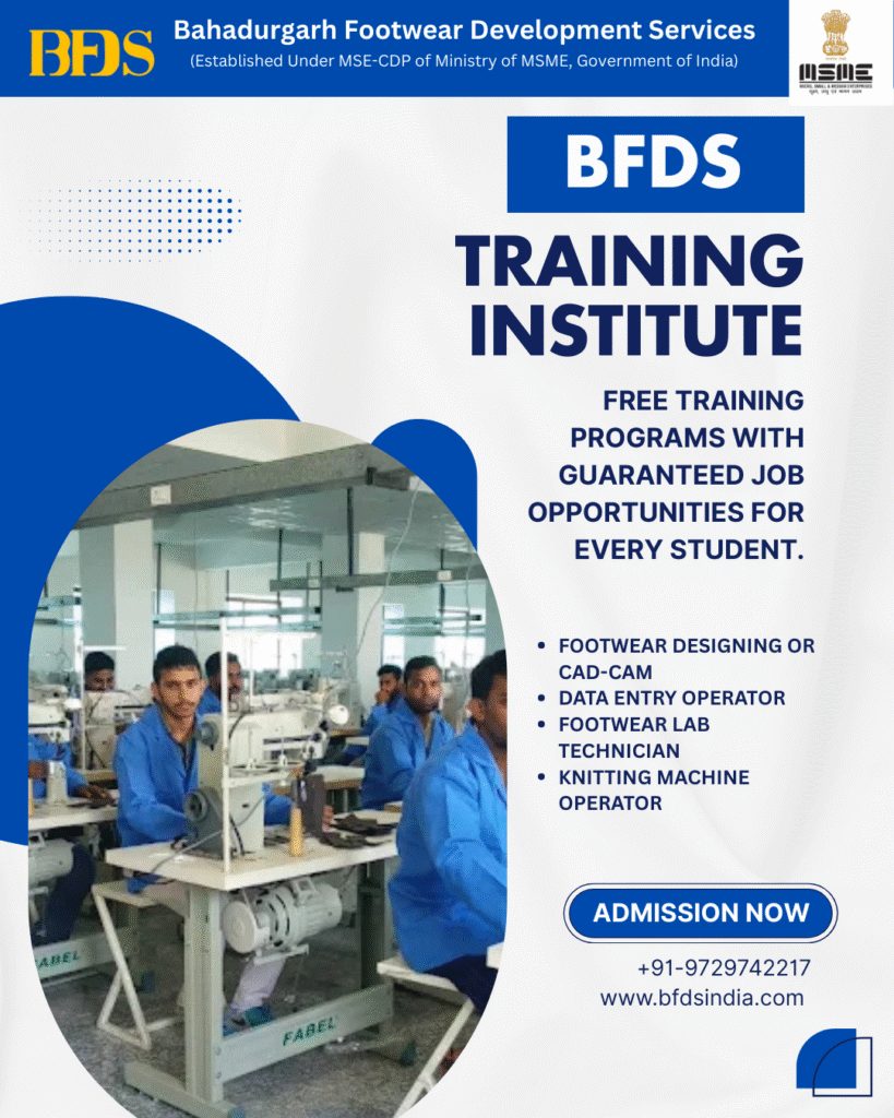 BFDS Bahadurgarh offers free, government-supported footwear skill development programs designed to help students build a strong and stable career in the manufacturing sector. With modern labs, industry-level machines, and expert trainers, BFDS provides practical training in Footwear Designing/CAD-CAM, Data Entry Operator, Footwear Lab Technician, and Knitting Machine Operator.
