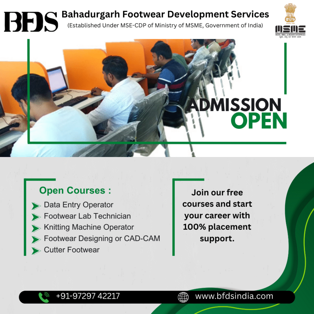 Bahadurgarh Footwear Development Services (BFDS), operating under the MSE-CDP scheme of the Ministry of MSME, Government of India, offers free, high-quality government-supported skill training programs designed to transform your future. These training courses are developed to help students, job-seekers, and professionals gain practical, industry-oriented skills that directly connect to real job opportunities.