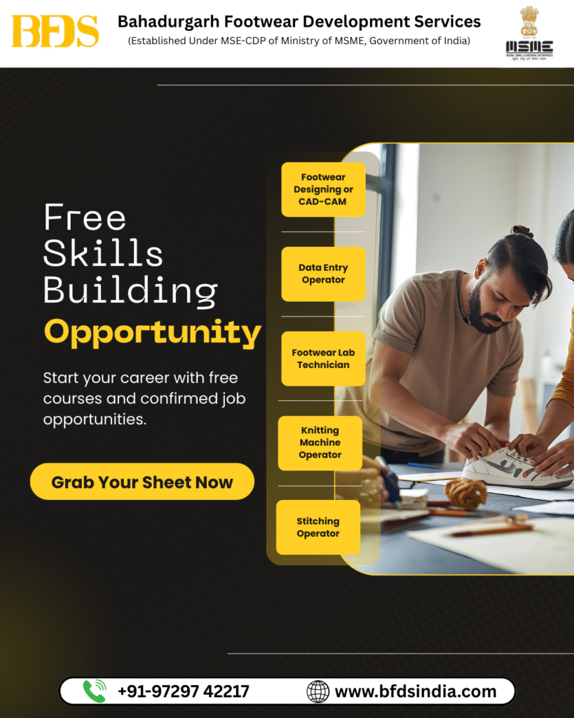 BFDS (Bahadurgarh Footwear Development Services) provides free, industry-focused skill-building programs designed to help students start a secure and successful career. This poster highlights key government-supported courses such as Footwear Designing/CAD-CAM, Data Entry Operator, Footwear Lab Technician, Knitting Machine Operator, and Stitching Operator.
