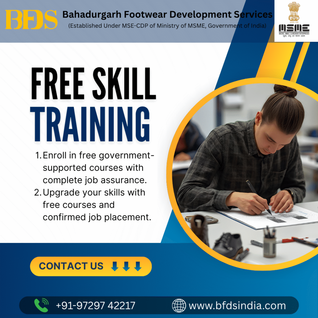 Bahadurgarh Footwear Development Services (BFDS), established under the MSE-CDP scheme of the Ministry of MSME, Government of India, offers 100% free skill training programs designed to help youth build strong career opportunities. These government-supported courses are created to develop industry-ready skills and ensure candidates receive complete job assurance after successful course completion.