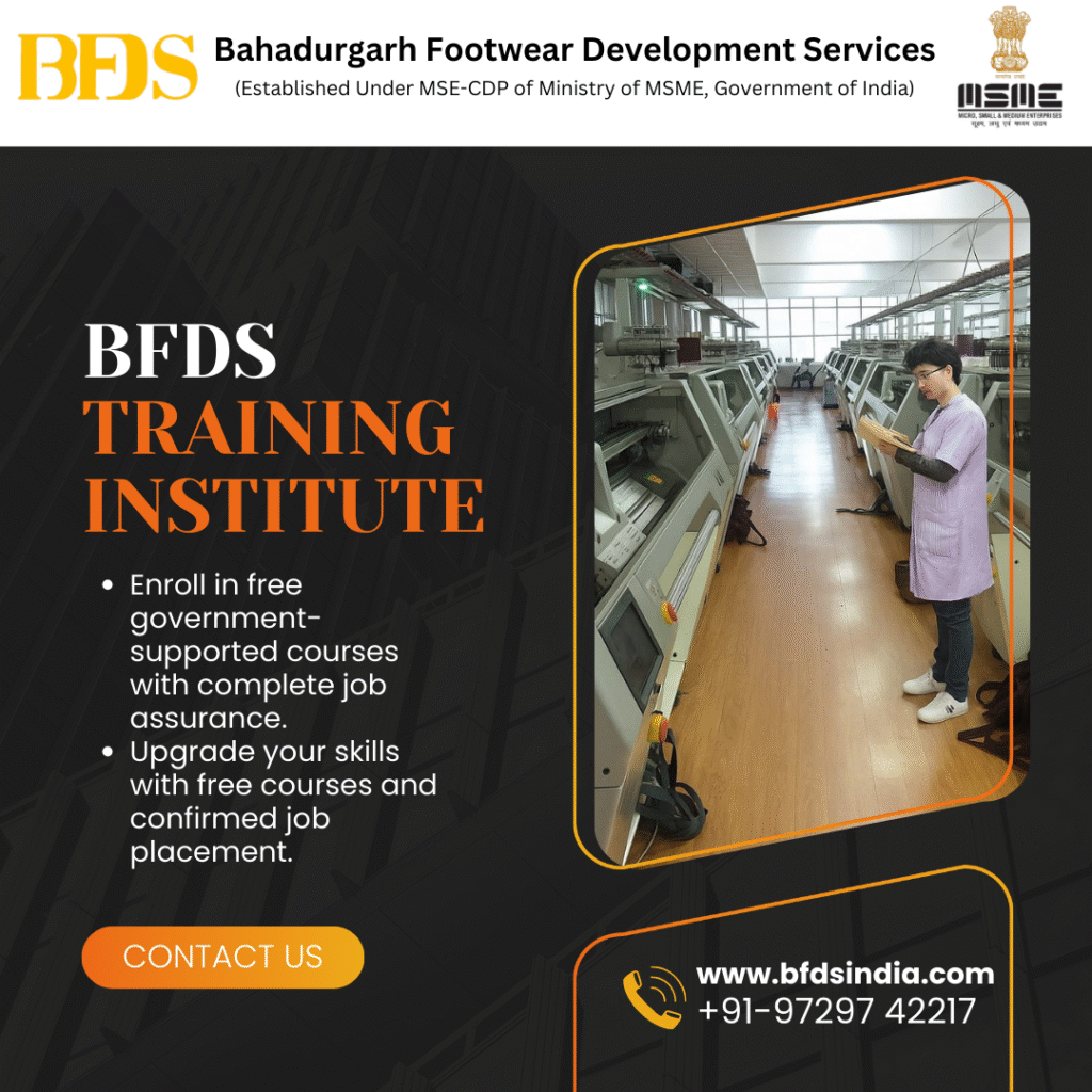 Bahadurgarh Footwear Development Services (BFDS) offers free, government-supported training programs designed to build strong career opportunities for youth. Our courses include Data Entry, Knitting Machine Operator, Shoe Manufacturing, and Shoe Designing (CAD–CAM). Each course provides practical, hands-on training along with complete job assurance after successful completion. Upgrade your skills and secure your future with certified training and confirmed placement support. For admissions, contact +91-9968222227 or visit www.bfdsindia.com.