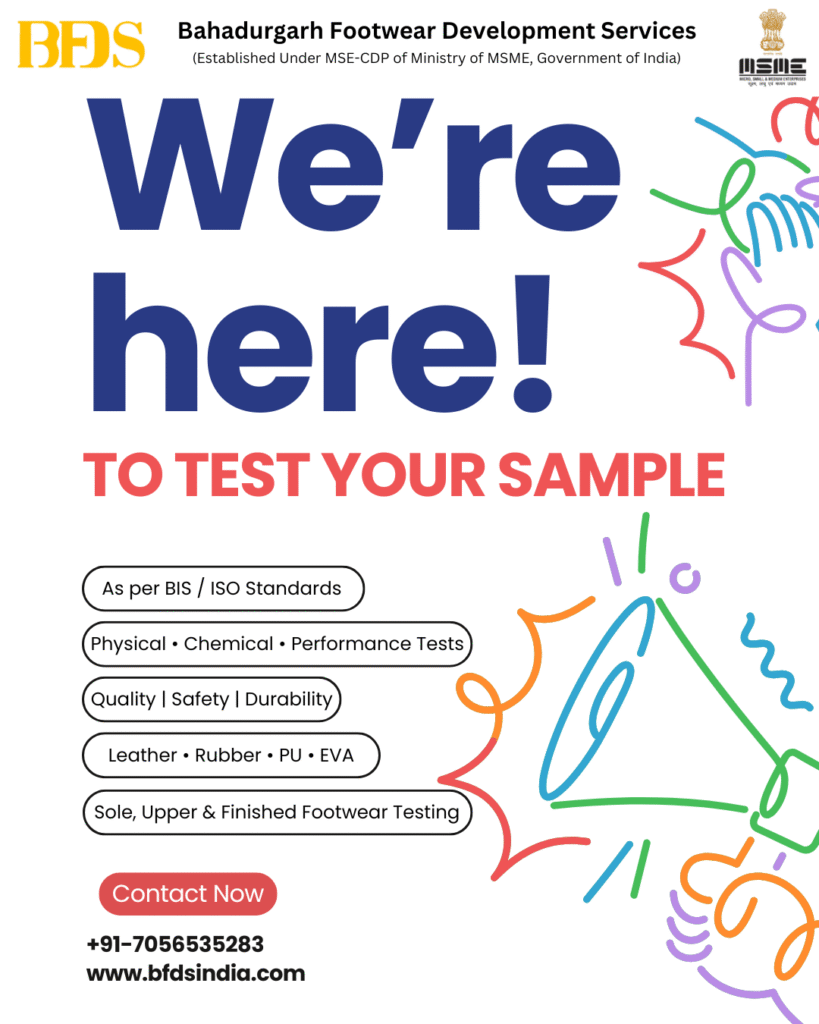 Bahadurgarh Footwear Development Services (BFDS) provides professional footwear sample testing services in Bahadurgarh to ensure product quality, safety, and durability. Established under the MSE-CDP scheme of the Ministry of MSME, Government of India, BFDS supports footwear manufacturers, exporters, and brands with reliable and standards-compliant testing solutions.