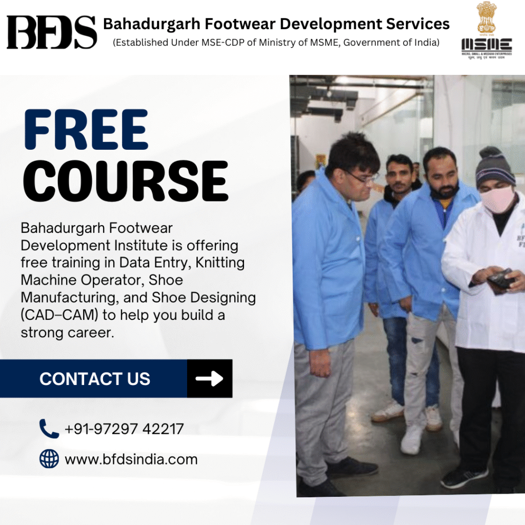 Bahadurgarh Footwear Development Services (BFDS) is offering completely free skill-based training programs to help youth build a strong and stable career. Courses include Data Entry, Knitting Machine Operator, Shoe Manufacturing, and Shoe Designing (CAD–CAM). Each program provides hands-on training, industry-relevant skills, and support for employment opportunities after course completion. For admission details, contact +91-97297 42217 or visit www.bfdsindia.com.
