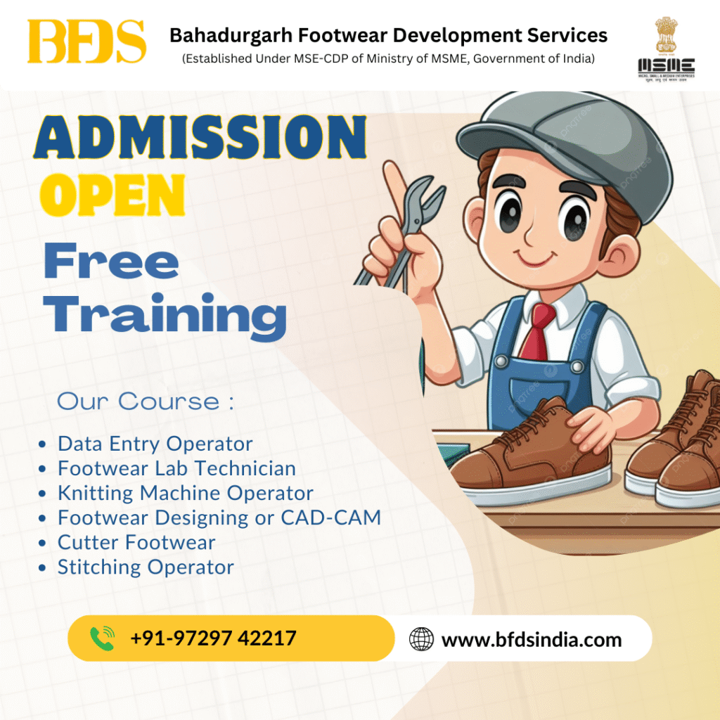 Bahadurgarh Footwear Development Services (BFDS) invites applications for admission open in free training courses aimed at skill development and employment generation. Established under the MSE-CDP scheme of the Ministry of MSME, Government of India, BFDS provides industry-focused training to help students build a successful career in the footwear sector.