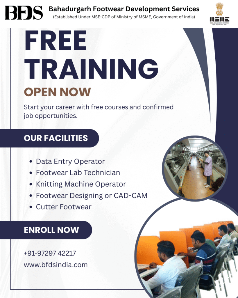 Bahadurgarh Footwear Development Services (BFDS) offers free skill-based training programs designed to help students and job seekers build a strong career in the footwear and allied industries. Established under the MSE-CDP scheme of the Ministry of MSME, Government of India, BFDS focuses on industry-relevant skills with practical training and employment support.