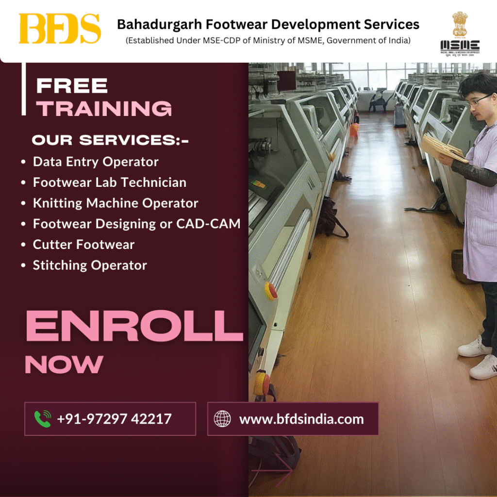 Bahadurgarh Footwear Development Services (BFDS) is a government-supported free footwear training institute in Bahadurgarh, Haryana, established under the MSE-CDP scheme of the Ministry of MSME, Government of India. BFDS is dedicated to providing skill-based vocational training with zero course fees and complete job placement support.