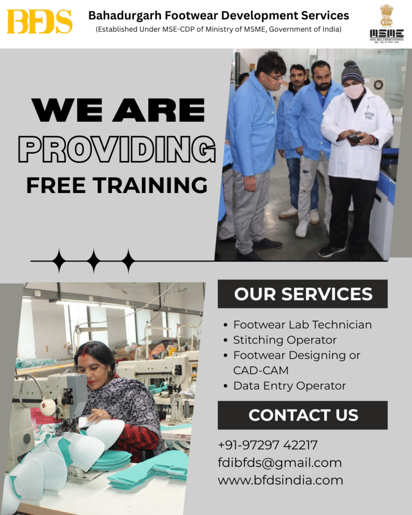 Bahadurgarh Footwear Development Services (BFDS) is providing free skill development training programs for youth and job seekers who want to build a stable career. BFDS is established under the MSE-CDP scheme of the Ministry of MSME, Government of India, and focuses on industry-oriented, practical training.