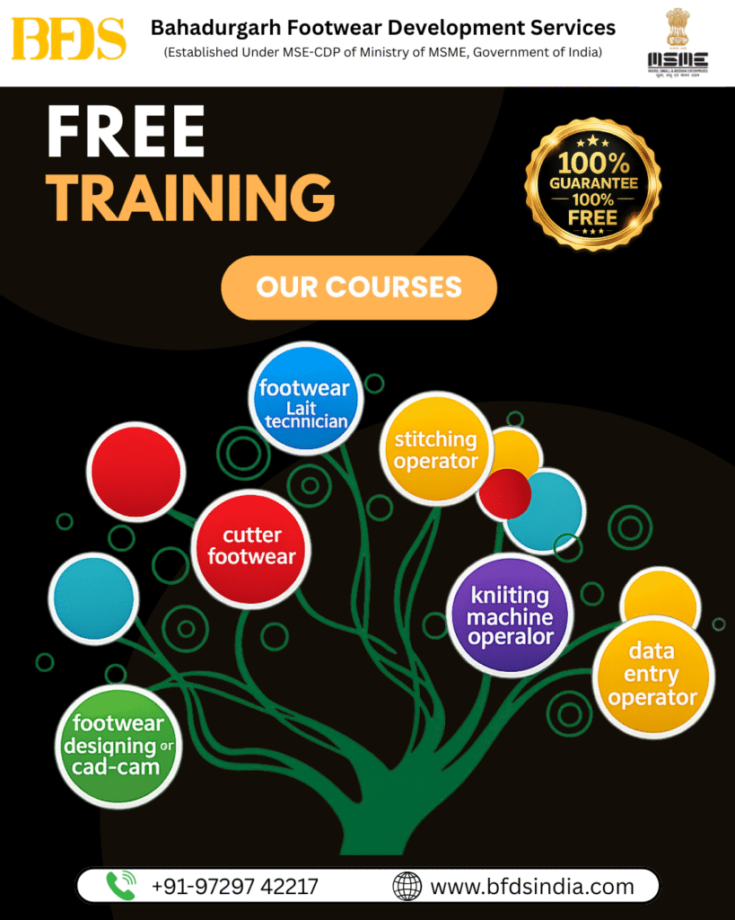 Bahadurgarh Footwear Development Services (BFDS) is a recognized skill development institute operating under the MSE-CDP scheme of the Ministry of MSME, Government of India, based in Bahadurgarh, Haryana. We are committed to empowering youth and professionals with industry-relevant skills through free, government-certified training programs.